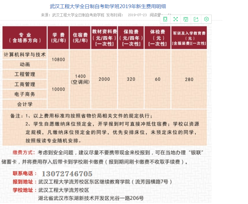 招生人数:为精细化管理,确保就业安置,各专业严格控制招生人数,名额有限,以缴费报到先后顺序为准,招满立即停止报到。自愿报名,缴纳报名费100元(入学报到后可以抵入学费),填写报名表录入个人资料,上交身份证和和高中或中等专业毕业证复印件,招生组注册后学校审核录取,7月下旬由学校统一寄发通知书。请报名学生要注意通讯畅通及查收。武汉工程大学全日制自考本科助学班2019年新生费用明细如下: